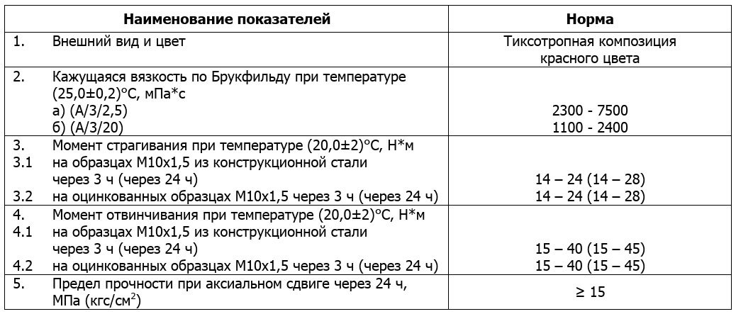 Тиксотропный герметик обеспечивает среднюю (М6-М16, ≤G⅜”) и высокую (М20-M24, G½”-G¾”) прочность. Для нестандартной и сорванной резьбы допускается зазор ≤0,25 мм. В линиях гидравлики и пневматики рабоче давление ≤250 атм.